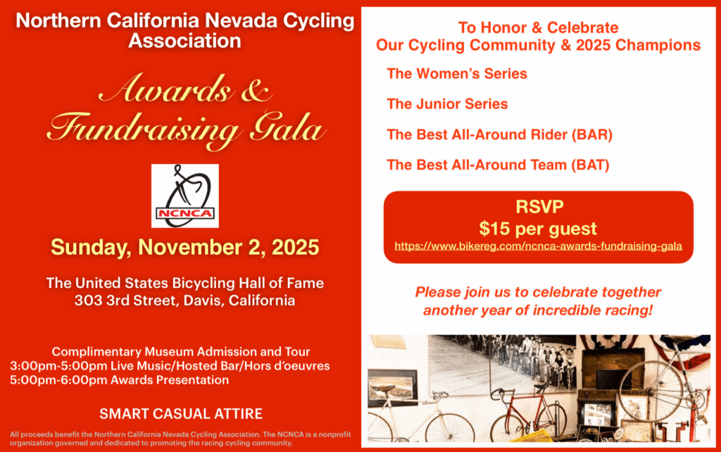 Get ready to celebrate a fantastic season of racing! Join your friends, teammates, and fellow competitors for the Northern California Nevada Cycling Association’s annual Awards & Fundraising Gala. This special evening is dedicated to honoring the outstanding achievements of our riders and the vibrant community that supports them.