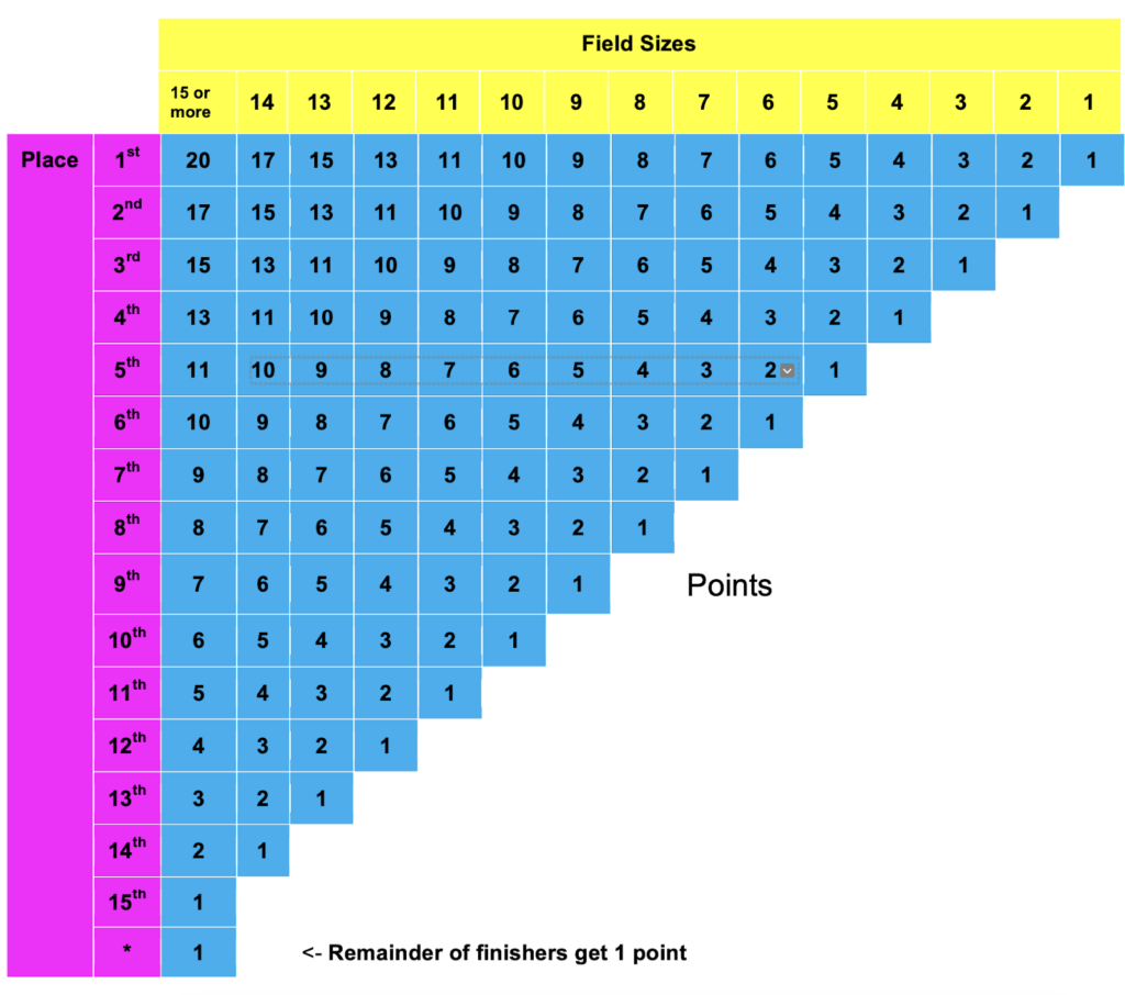 Racers earn points at each race in accordance with the table below. More points are awarded in races with more racers in their specific age and gender group. If multiple age/gender groups race together, points are still calculated separately for each group.